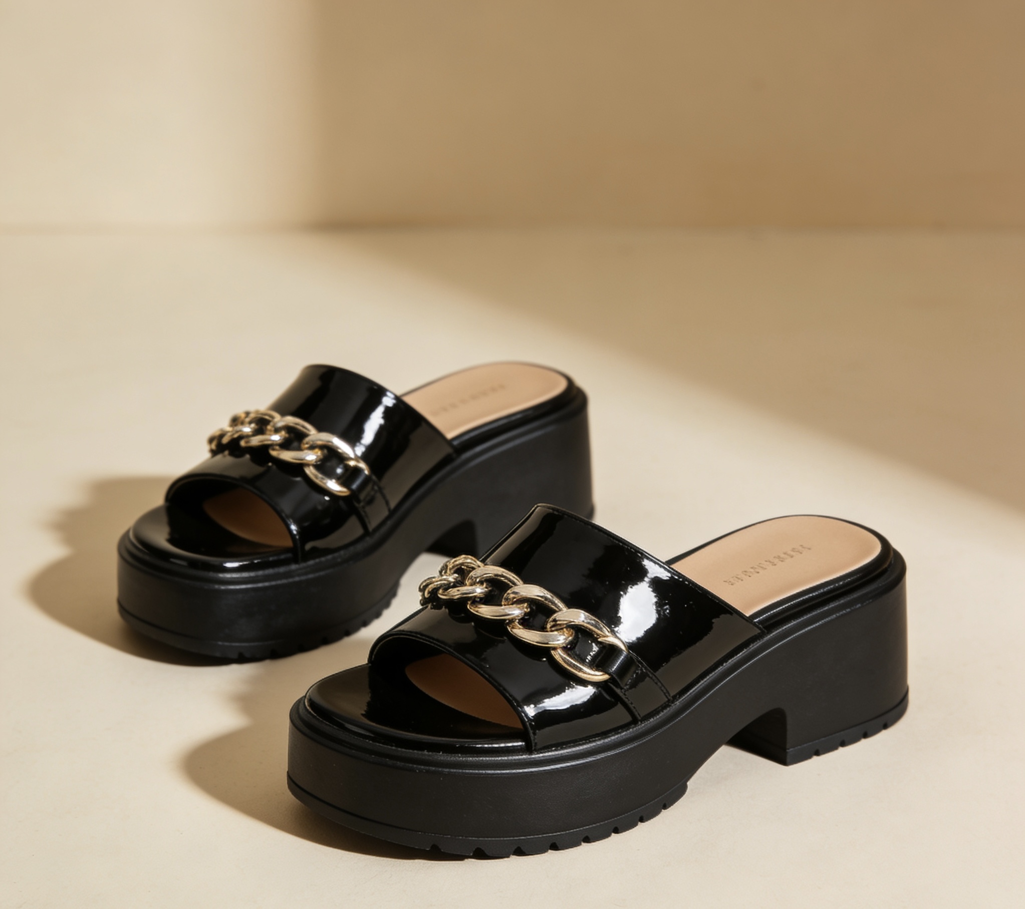 Our Patent Leather Chain Platform Mules are crafted for B2B buyers seeking a footwear piece that fuses high-gloss sophistication with industrial edge. The upper is made from premium patent leather, delivering a mirror‑like shine that instantly elevates any outfit while remaining easy to clean and maintain. Strategically placed metal chain details—available in gunmetal, silver, or aged brass—wrap around the strap or accent the vamp, adding a bold, modern twist reminiscent of contemporary street and runway styles. The platform sole provides substantial height and a stable base, embracing the chunky aesthetic that’s popular in fashion-forward and Y2K-inspired collections. The slip‑on mule silhouette ensures quick, fuss‑free wear, making it ideal for fast‑paced urban life, nightlife scenes, and event dressing. A cushioned footbed enhances comfort for dancing or city exploration, while the durable synthetic or rubber outsole ensures reliable traction on various surfaces. The glossy finish and chain embellishments make these mules a standout choice for boutique labels, designer capsules, and retailers targeting customers who crave daring, fashion‑first statements. Perfect for pairing with monochrome tailoring, edgy separates, or minimalist dresses, they bring a confident, fashion‑centric attitude to any look. Available in customizable patent finishes, chain styles, platform heights, and optional branding (embossed logo, foil stamp, custom box), they can be tailored to match brand identity and target markets. With flexible MOQ, private label services, and competitive wholesale pricing, they’re a high‑perceived‑value product for global retailers aiming to offer runway‑inspired glamour with an urban, rebellious spirit.