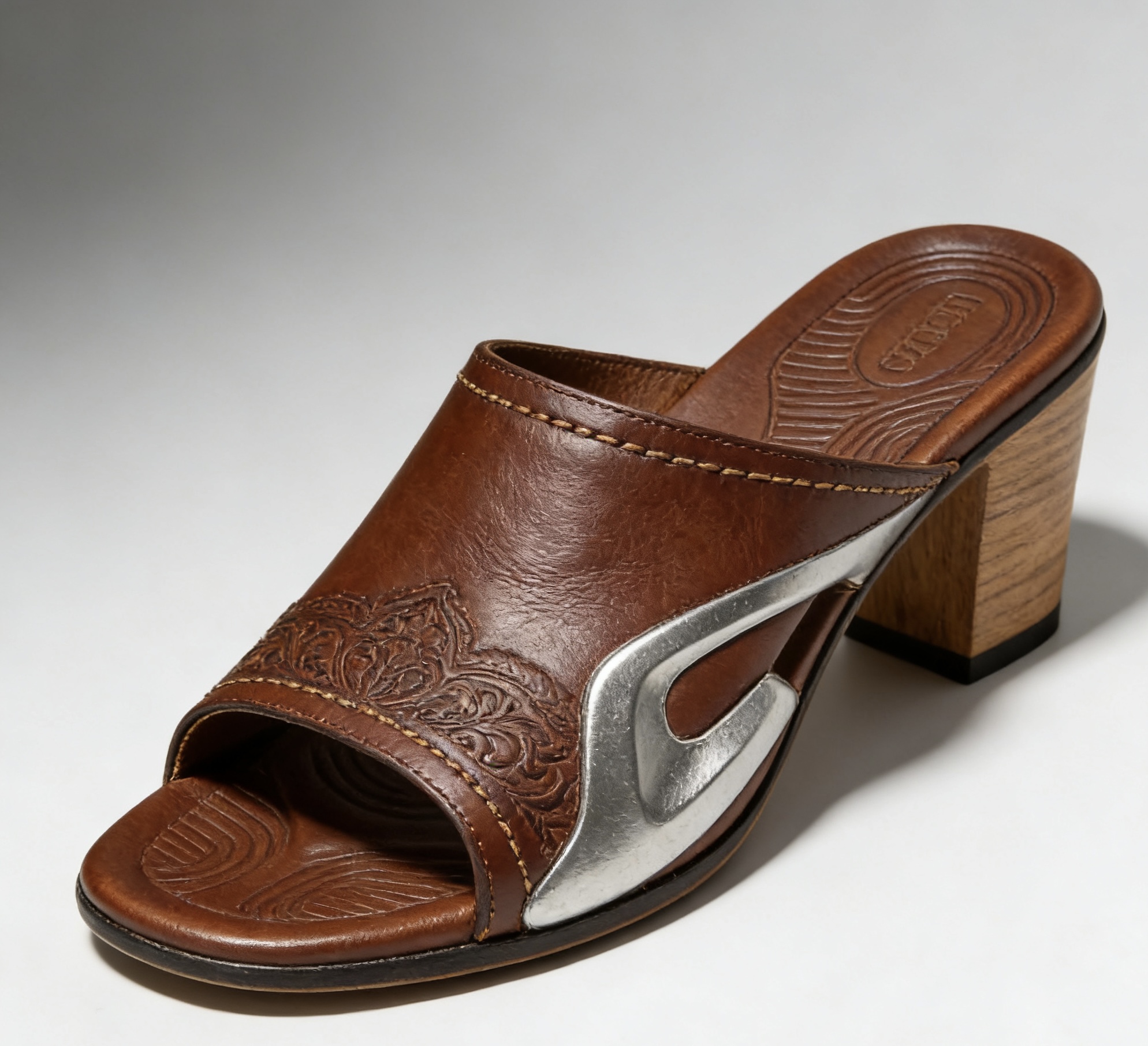 Tooled Leather Wooden Heel Mule