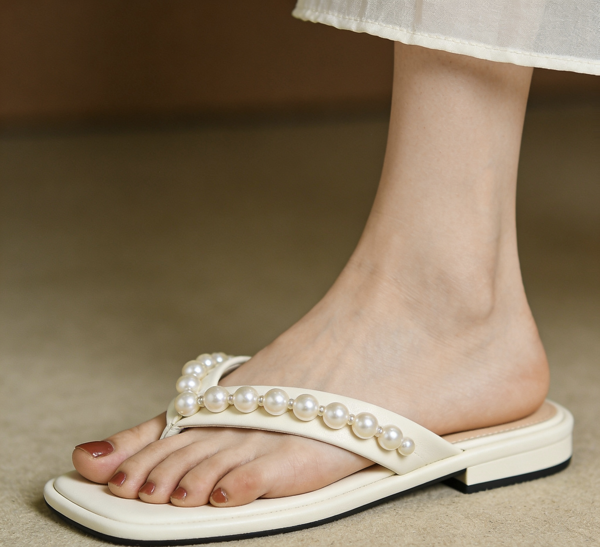 Ivory Leather Pearl Embellished Flat Flip Flop