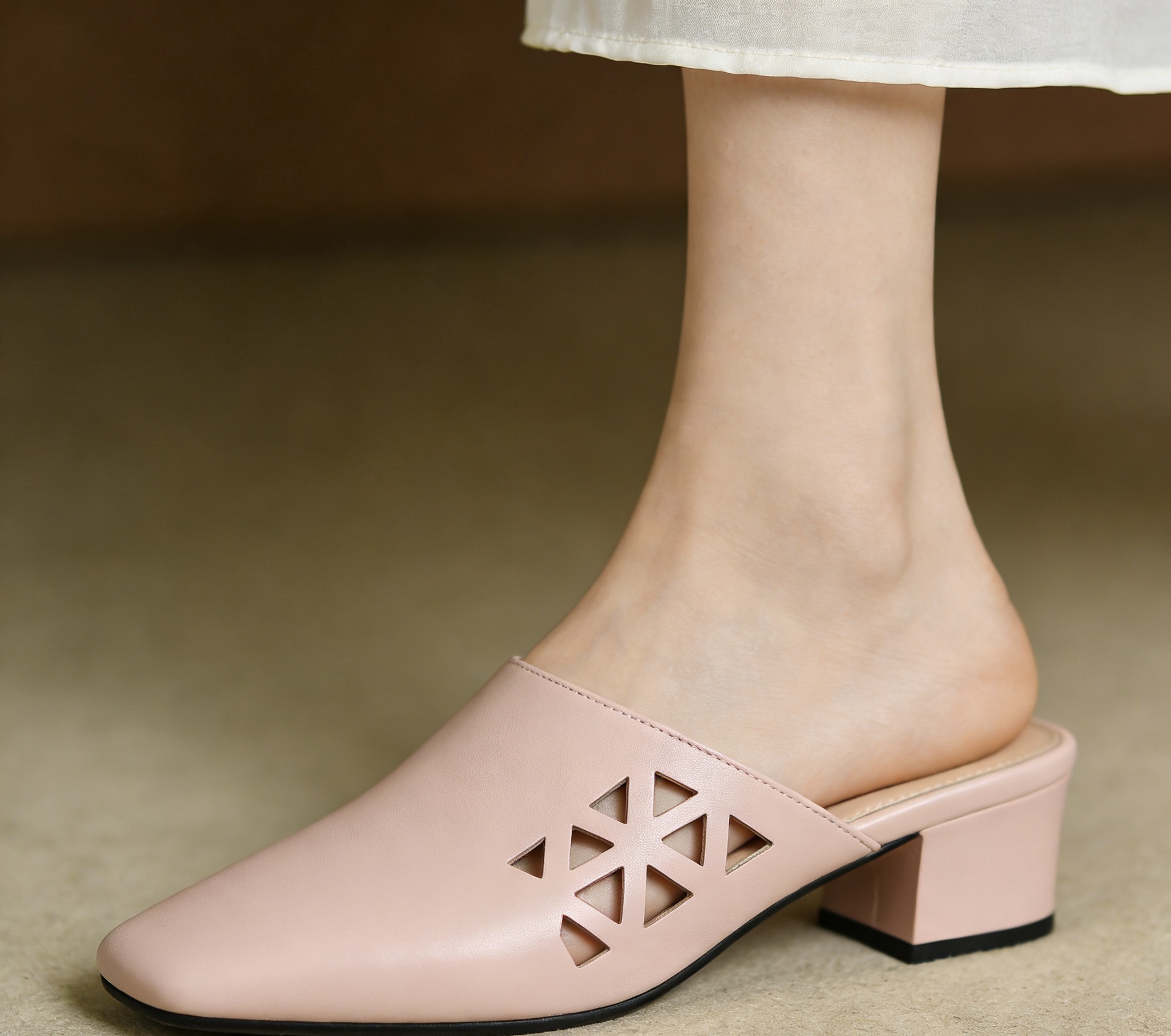 Blush Pink Leather Geometric Cut-Out Block Heel Mule