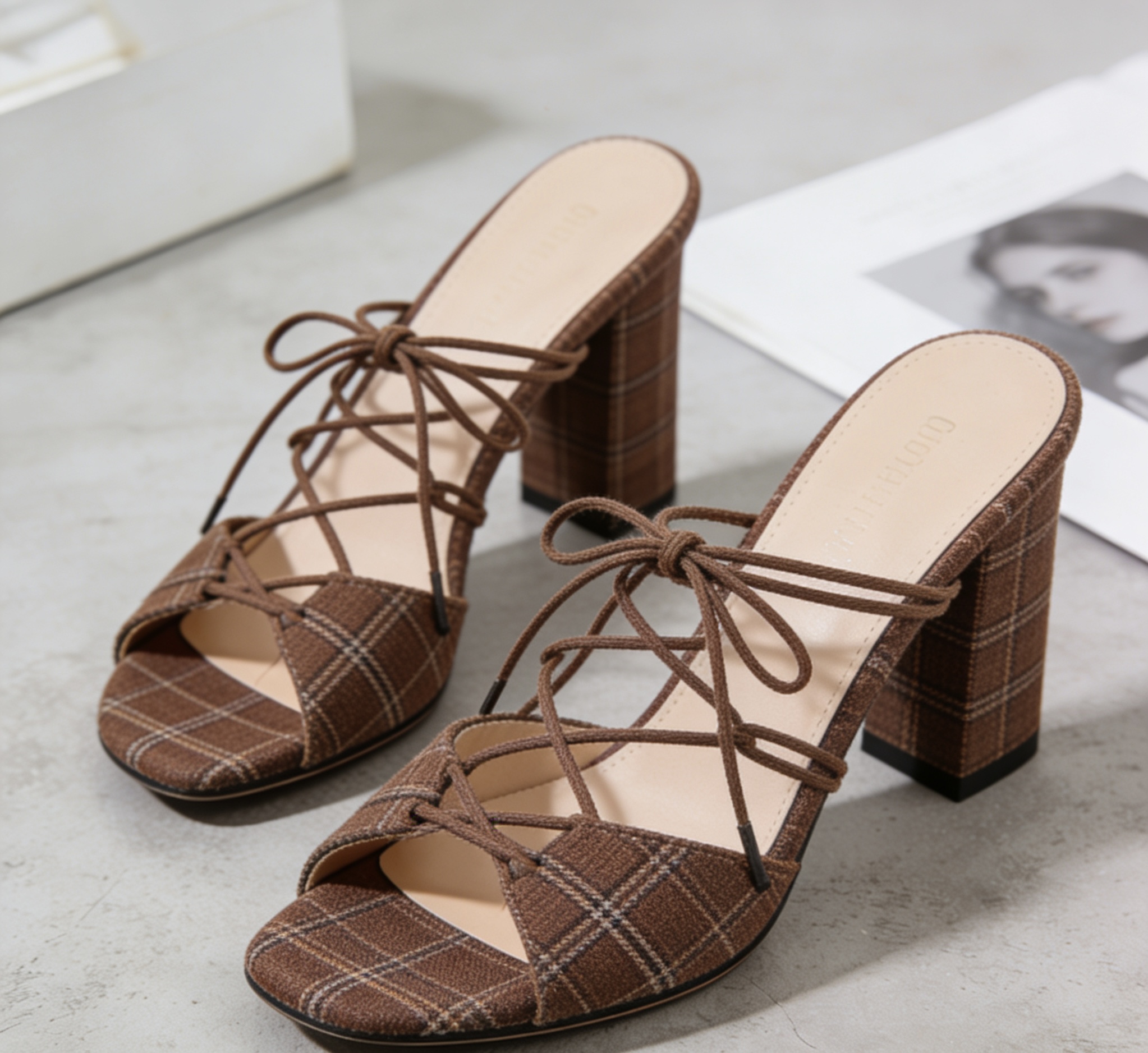 Brown Plaid Fabric Block Heel Lace-up Mules